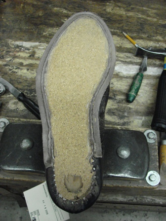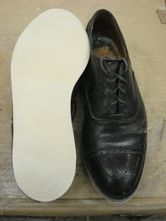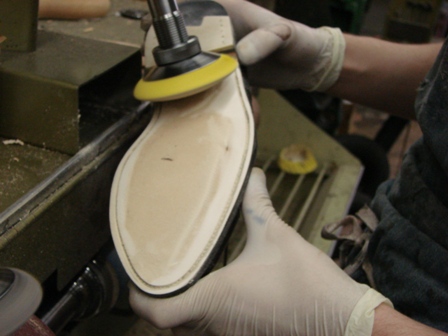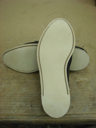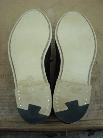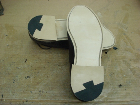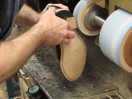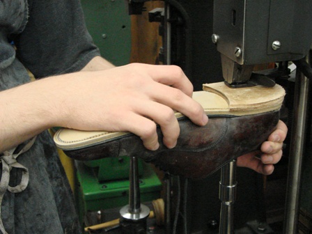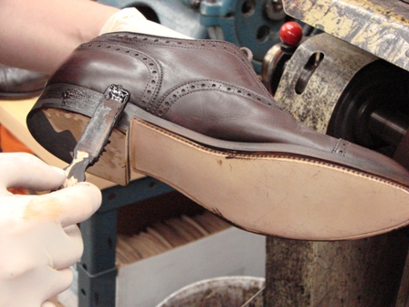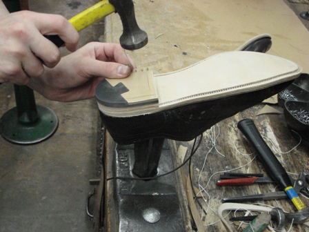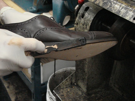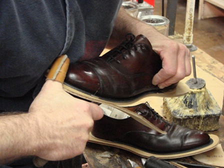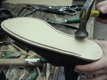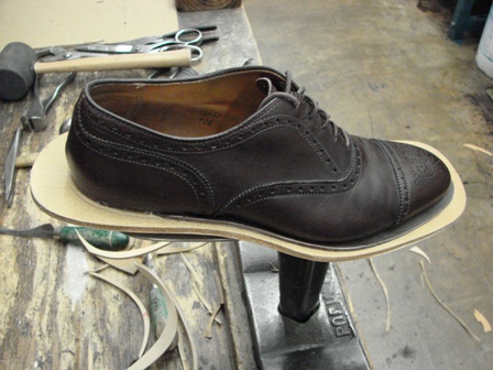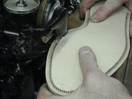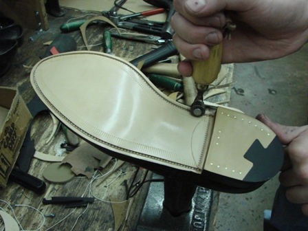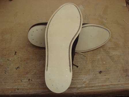 Stripping the soles and heels Soles, heels, welts,welt stitches, and old nails have removed Hand stitching the new welts. All Rewelting is now complete stitches must go into the original stitch holes. New soles have been cemented in place Soles are now rough trimmed and pressed with hand tools so as not to by hand. distort or "cup" the shape of the shoe Soles have their first