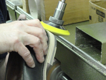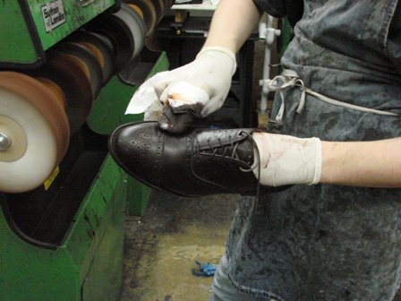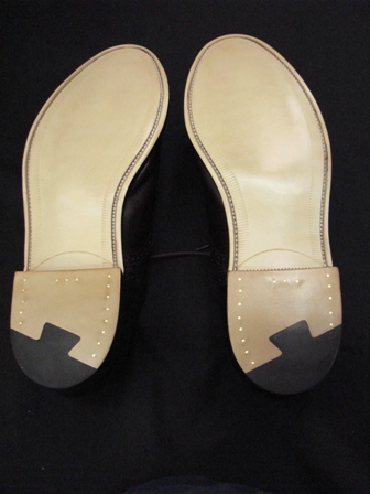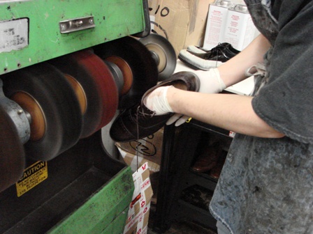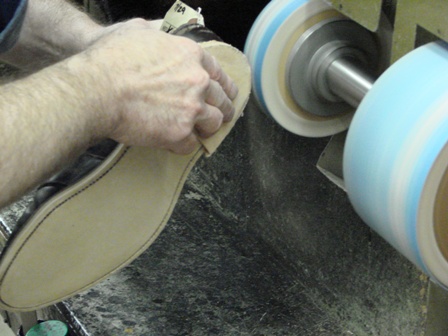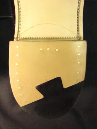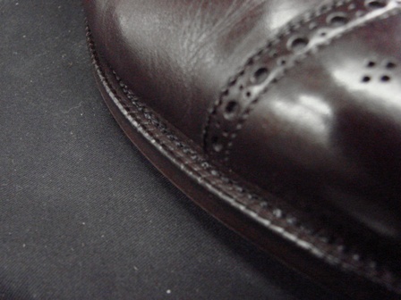 Sole bottoms are sanded twice to produce a very smooth surface with no sanding marks to accept the bottom finish. Bottoms are finished with a clear natural stain. After finishing the soles with a natural color wax, polish of the appropriate type and color is applied by hand and buffed with horsehair brushes. Following polishing, shoes are are buffed with rag brushes to produce a like new, natural shine. We never use spray products of any kind. Applying decorative markings to the soles Closeup of decorative markings and heel breastings. Welts are "wheeled" by a specialized machine using 16, 24, or 32 notches per inch whichever the shoe was originally manufactured with. This is a closeup of the wheeling. The finished product showing the upper and the bottom Why settle for anything else? |