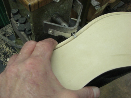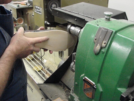 The completed heel assembly is now carefully sanded and shaped a second time for proper angles. Toplifts are now hand