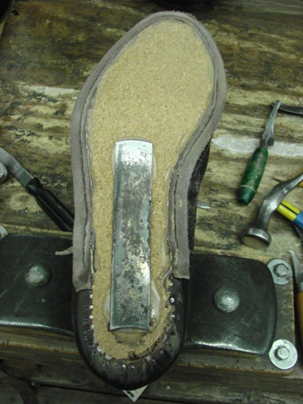 Next a channel is cut into the sole to accept the new stitches Stitching the outsole to the welt. Machine is set to make the same stitch length as the original. Stitches never fall out of the channel. Heel seats are nailed by hand with the proper size of clinching nails. Nailing machines are never used to shoot nails into the heel seats of shoes. Soles are now stitched and nailed awaiting the second trimming. new leather heel bases are attached with cement and nails to prevent any squeaking.They are then rough trimmed by machine Toplifts are attached